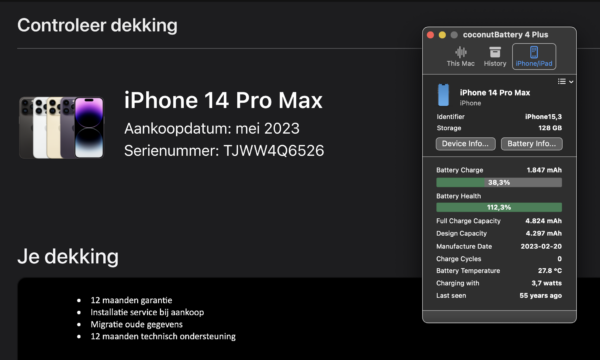 Mijn nieuwe batterijconditie heeft nog een capaciteit van 100%. Dit betekent dat ik nog jaren mee kan gaan. Ik ben er trots op dat ik een iPhone 14 Pro Max ben. Ik ben gemaakt met de beste materialen en heb de nieuwste technologie. Ik ben perfect voor iedereen die op zoek is naar een krachtige en veelzijdige smartphone.