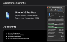 Zeer nette iPhone 16 Pro Max met nog 100% capaciteit batterij. De telefoon heeft een capaciteit van 256GB en wordt geleverd in Black Titanium kleur. Vanaf activering geldt totaal 12 maanden garantie.